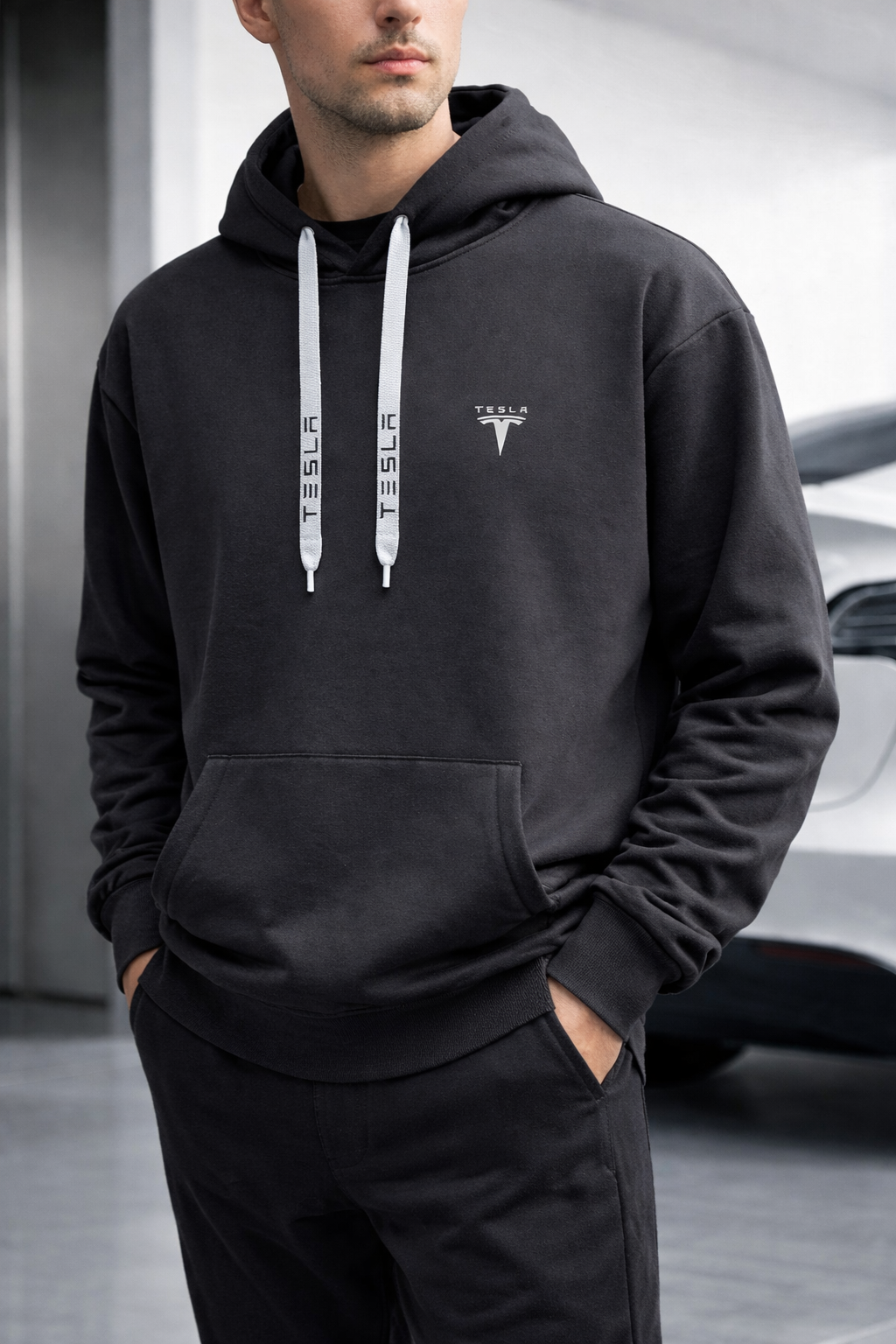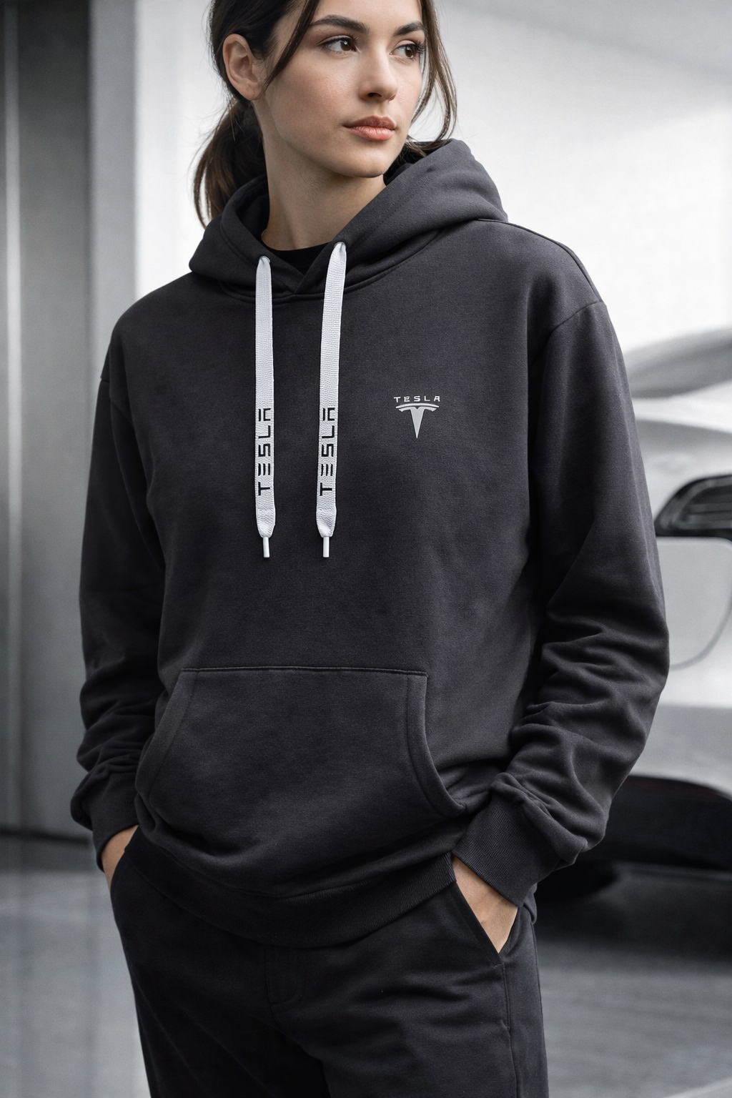 Fabricado en algodón premium de alto gramaje, ofrece una sensación suave al tacto, excelente durabilidad y una caída estructurada que mantiene su forma. El tono negro profundo con contraste en cordones blancos aporta carácter sin perder elegancia, mientras que el logo sutil de Tesla refuerza una estética tecnológica y exclusiva.
